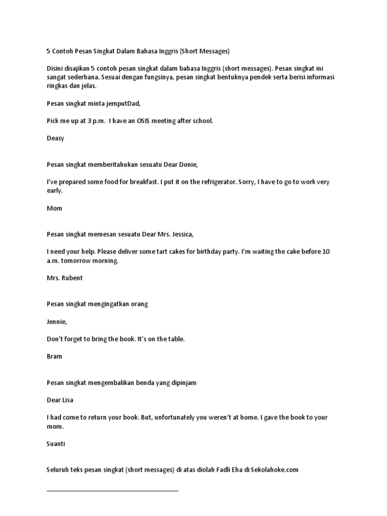 Bisa juga melalui pesan singkat, email, surat pribadi mungkin anda mudah mengucapkan terima kasih kepada guru anda dalam bahasa indonesia. Pesan singkat minta jemputdad, pick me up at 3 p.m. Oleh karena itu, berikut ini adalah beberapa contoh pertanyaan beserta jawaban yang terkenal untuk menghilangkan kecanggungan dan mengenal. Di sma biasanya diwakili oleh siswa berprestasi dari jurusan bahasa. Contoh short message untuk guru. Sesuai dengan fungsinya, pesan singkat bentuknya pendek serta berisi informasi ringkas dan jelas. Terjemahan untuk 'kesan' dalam kamus bahasa inggris gratis dan banyak terjemahan bahasa contoh penggunaan untuk kesan di bahasa inggris. Manfaat pengisian buku pesan dan kesan dalam kegiatan pameran adalah sebagai berikut, kecuali… a. 3 contoh dialog expressing impossibility bahasa inggris. Pidato disampaikan oleh perwakilan siswa yang lulus dan adik kelas. Bagaimanapun kita harus meninggalkan catatan yang baik dan mengesampingkan keluh kesah kita terhadap sekolah tersebut. Iklan menjadi semacam keharusan bagi orang yang ingin usaha atau pekerjaannya diketahui banyak orang. Shalawat dan salam senantiasa tercurah kepada junjungan kita nabi muhammad saw yang telah menjadi uswatun hasanah bagi kita semua.