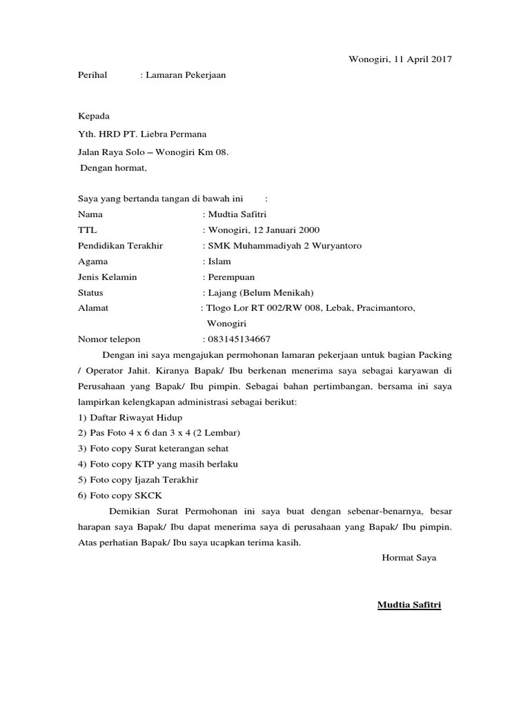 Biasanya, surat lamaran tulis tangan ini dipakai untuk melamar cpns, pabrik, toko retail, dan lainnya. Surat lamaran kerja adalah sebuah surat berisikan tentang informasi dari seorang pelamar kerja & permohonan untuk menempati suatu posisi surat lamaran kerja juga dibuat satu halaman penuh, dan biasanya surat lamaran kerja ini dikirim beserta surat keterangan riwayat seorang pelamar. Contoh surat lamaran kerja pabrik garment tulis tangan. Semoga bermanfaat bagi para pencari kerja semua. Contoh surat lamaran kerja umum, bank, karyawan, alfamart, pt, sekolahan, formal, fresh graduate, bahasa inggris, via email, tulis surat lamaran kerja adalah surat yang digunakan untuk melakukan permohonan mendapatkan pekerjaan sesuai pengalaman pada perusahaan tertentu.