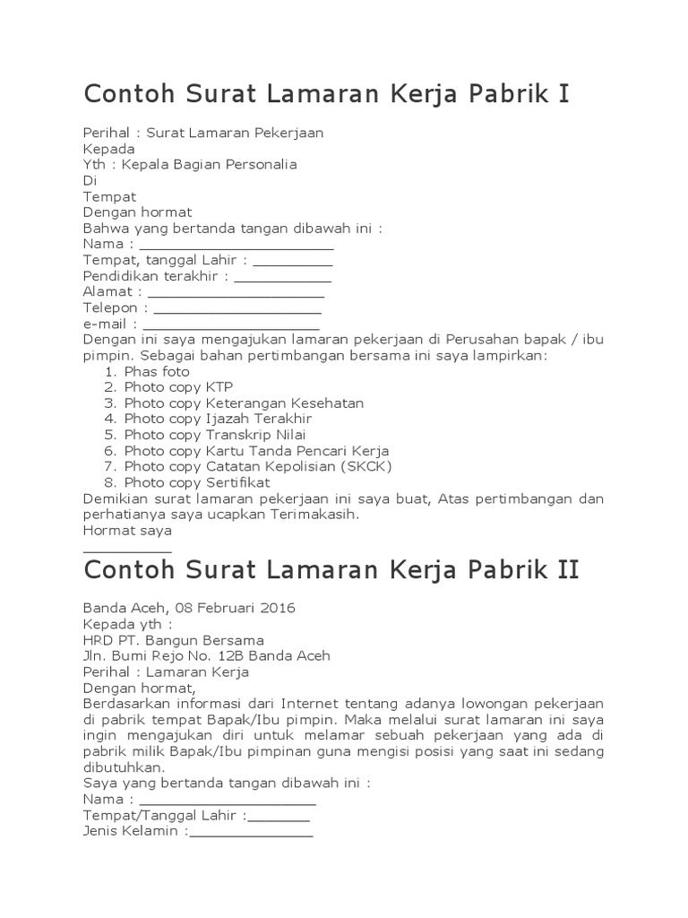 Download Contoh Surat Lamaran Kerja Di Pabrik Panduan Lengkap from contohsuratlengkap.org Di dalam membuat surat lamaran kerja tulis tangan mimin ada beberapa anjuran ini, supaya terlihat lebih profesional dan menarik seperti berikut ini. Jika ada persyaratan khusus dari perusahaan untuk menulis tangan maka buatlah surat dengan tulisan tangan. Semoga bermanfaat bagi para pencari kerja semua. Jika tulisan tangan surat lamaran kerja tersusun dengan baik dan rapi meski tulisannya kurang bagus hal itu sudah cukup menambah nilai plus diri. Langsung saja simak contoh surat lamaran kerja 2021 tulis tangan yang baik dan benar dibawah ini untuk referensi penulisan lamaran pekerjaan yang benar. Tentu harapan terbesar kami, anda dapat diterima di pabrik yang diinginkan menggunakan surat lamaran yang terbuat di. Gunakan contoh surat lamaran kerja sebagai karyawan pabrik di bawah ini sebagai contoh dan patokan saat menulis surat lamaran kerja. Pastikan surat lamaran ini ditulis dengan rapi dan dapat dibaca dengan jelas sehingga peluang untuk diterima perusahaan atau instansi pun semakin besar.